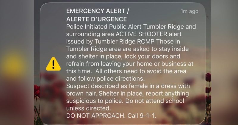 据加拿大皇家骑警(RCMP)发布的官方信息称,当天下午 1:20 左右接报称 Tumbler Ridge 中学内有“活跃枪手”。警方迅速出动,在约两分钟内抵达现场,并随即发布紧急公共警报(Police Initiated Public Alert),呼吁居民避难并锁门。
